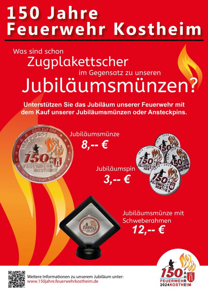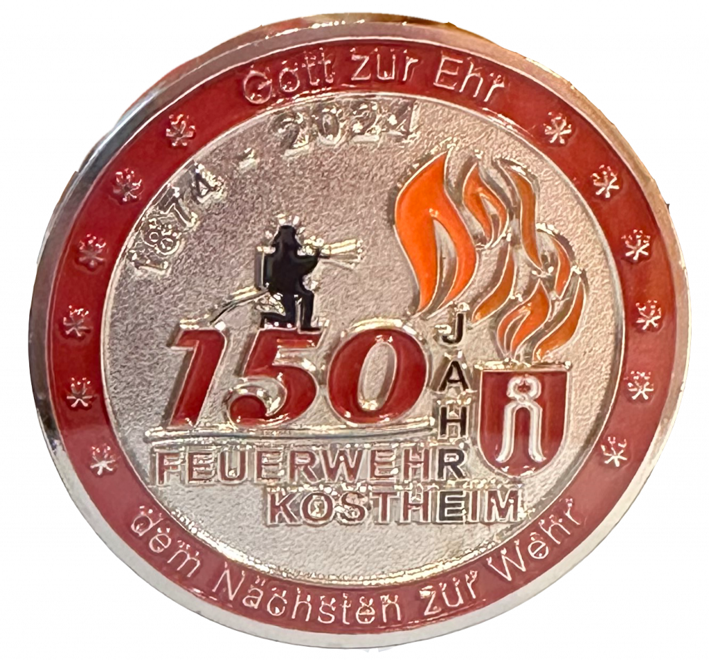 Wer von uns vorab die Münze (einzel oder im Schweberahmen) oder den Ansteck-Pin erwerben möchte, möge bitte eine kurze Mail an 150jahre@feuerwehrkostheim.de schreiben oder das Kontaktformular unserer Internetseite nutzen. Wir setzen uns dann mit Ihnen in Verbindung und klären die weiteren Details.