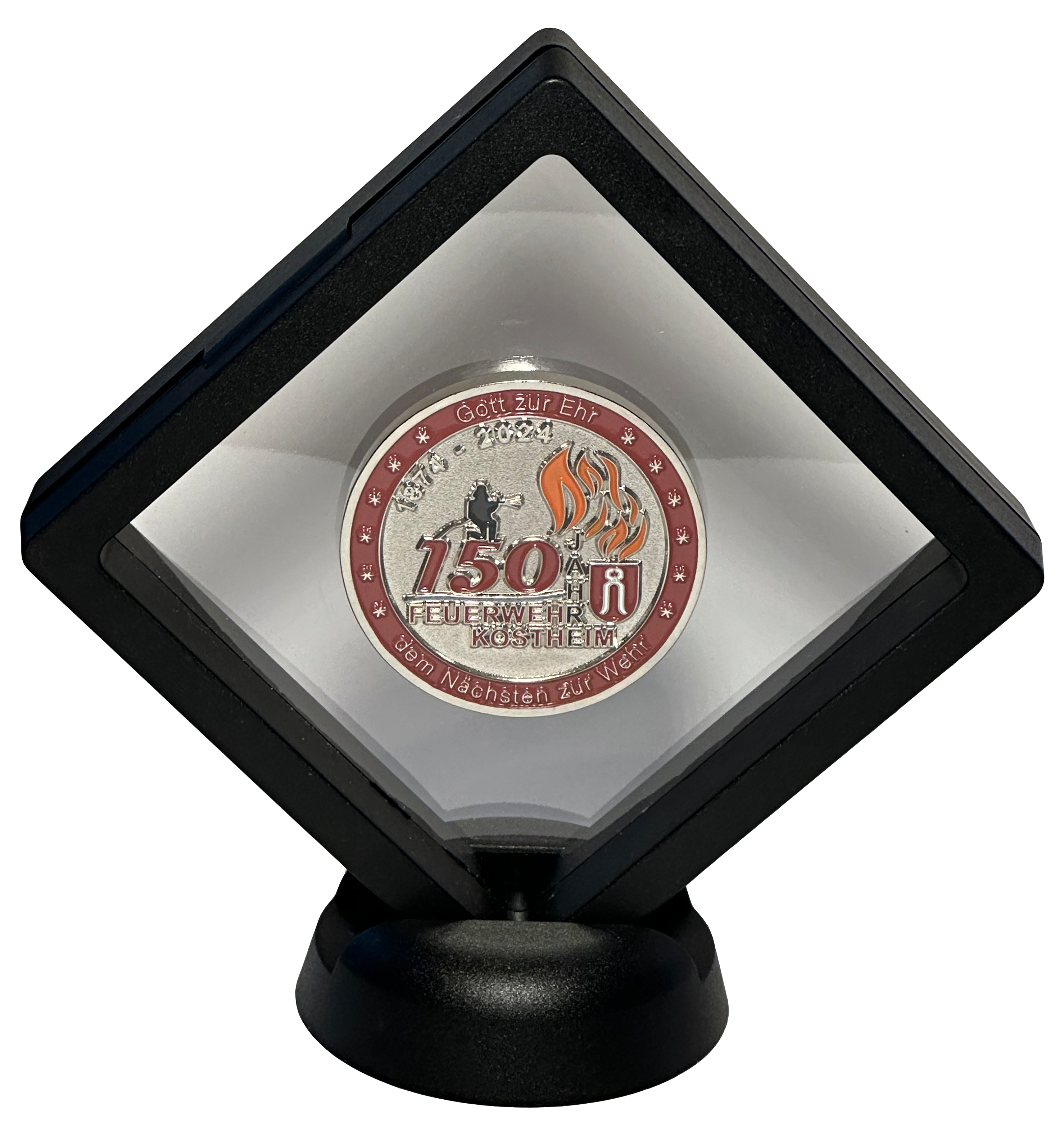 Mit der Jubiläumsmünze konnte ein ganz besonderes Andenken oder Geschenk kreiert werden, welches auf der Vorderseite das eigens für das Fest kreierte Logo ziert. Auf der Rückseite ist unser Florian, zusammen mit dem Kostheimer Ortswappen geprägt. Die Münze hat einen Durchmesser von 45 Millimeter und kann nach Bedarf auch anschaulich in einem Schweberahmen (ebenfalls bei uns erhältlich) optisch schwebend aufgestellt werden.