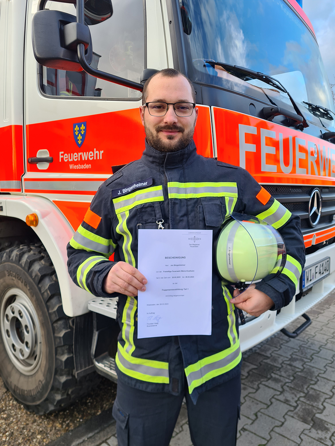 Da der Nachwuchs der Kostheimer Feuerwehr in der Regel aus den Kinder- und Jugendabteilungen in die Einsatzabteilung übertritt, freut es uns um so mehr, mit Jan Bingenheimer nun einen Quereinsteiger – also ohne jegliche Feuerwehrvorkenntnisse z.B. aus der Jugendfeuerwehr – für das etwas andere Hobby Feuerwehr gewinnen zu können. Es zeigt, dass man auch ohne vorherige Kenntnisse aus den Nachwuchsabteilungen, seinem Traum „Feuerwehrmann oder Feuerwehrfrau zu werden“ verwirklichen kann.