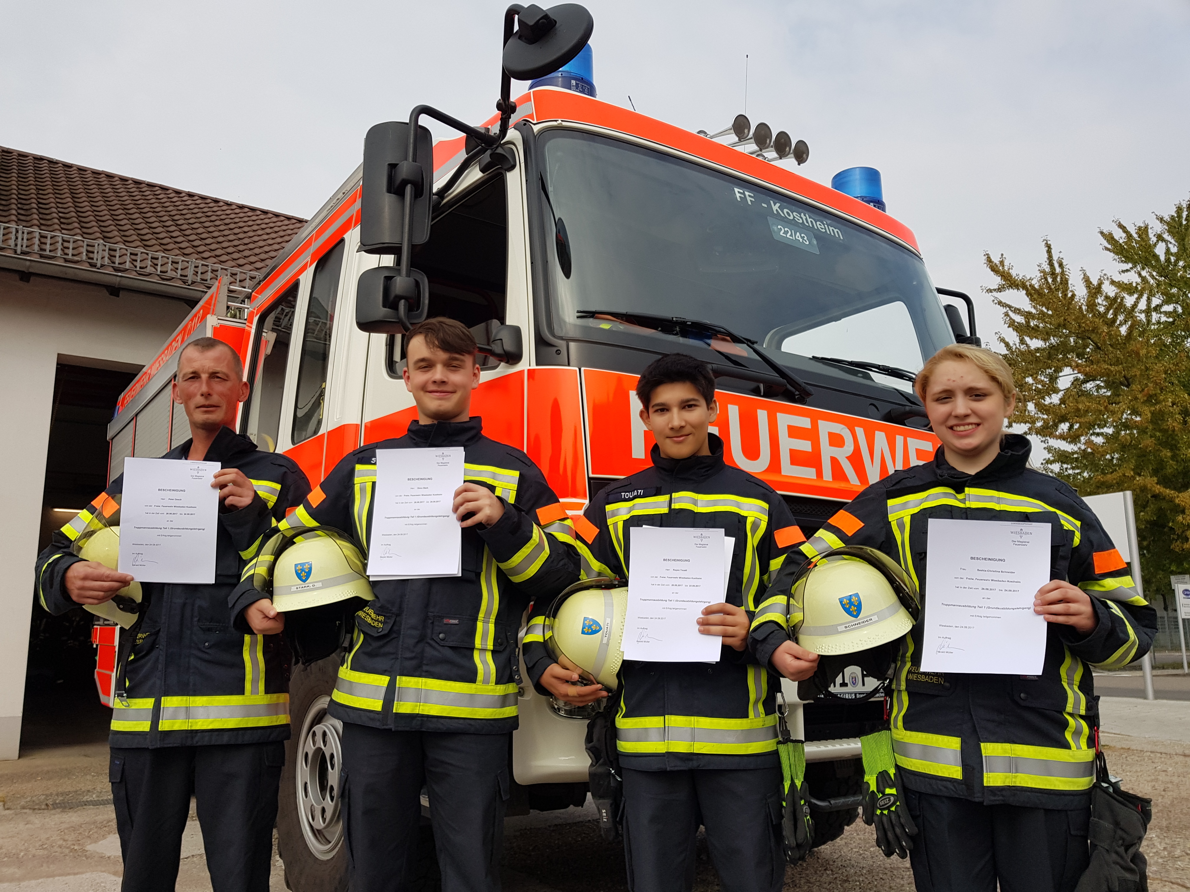 Die Kostheimer Feuerwehr gratuliert Saskia Schneider, Peter Desch, Dimo Stark und Rayen Touati zur bestandenen Grundlehrgangsprüfung und wünscht ihnen stets viel Erfolg bei ihren kommenden Einsätzen.