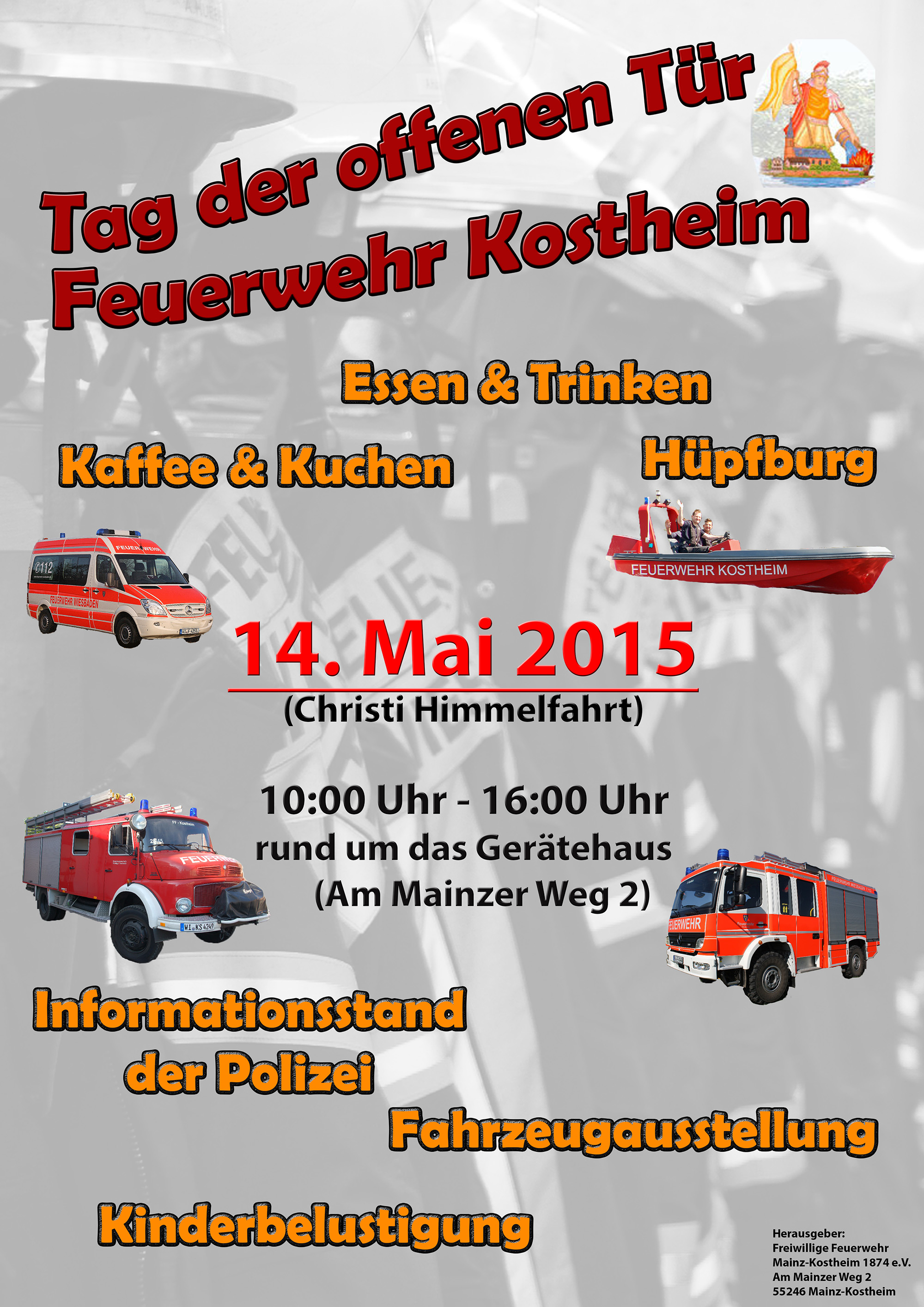 Am 14. Mai 2015 (Christi Himmelfahrt / Vatertag) veranstaltet die Feuerwehr Kostheim ihren diesjährigen “Tag der offenen Tür” rund um das Gerätehaus “Am Mainzer Weg”. In der Zeit von 10 bis 16 Uhr sind alle Türen und Tore geöffnet und interessierte Bürger können sich ausführlich rund um das Thema Feuerwehr informieren.