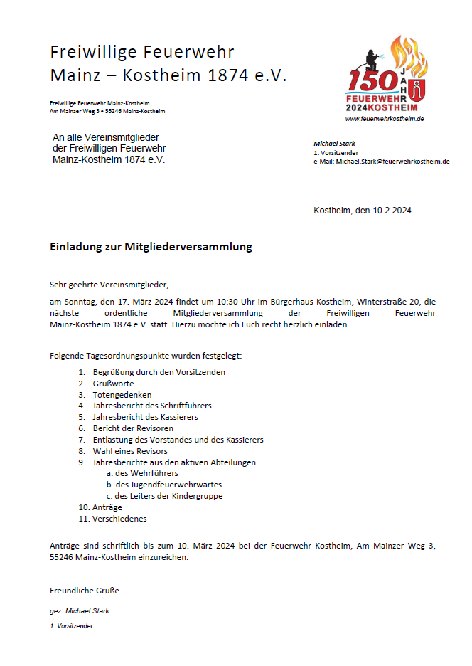 Die Mitgliederversammlung findet am Sonntag, den 17. März 2024 um 10:30 Uhr im Bürgerhaus Kostheim , Winterstraße 20, statt.
