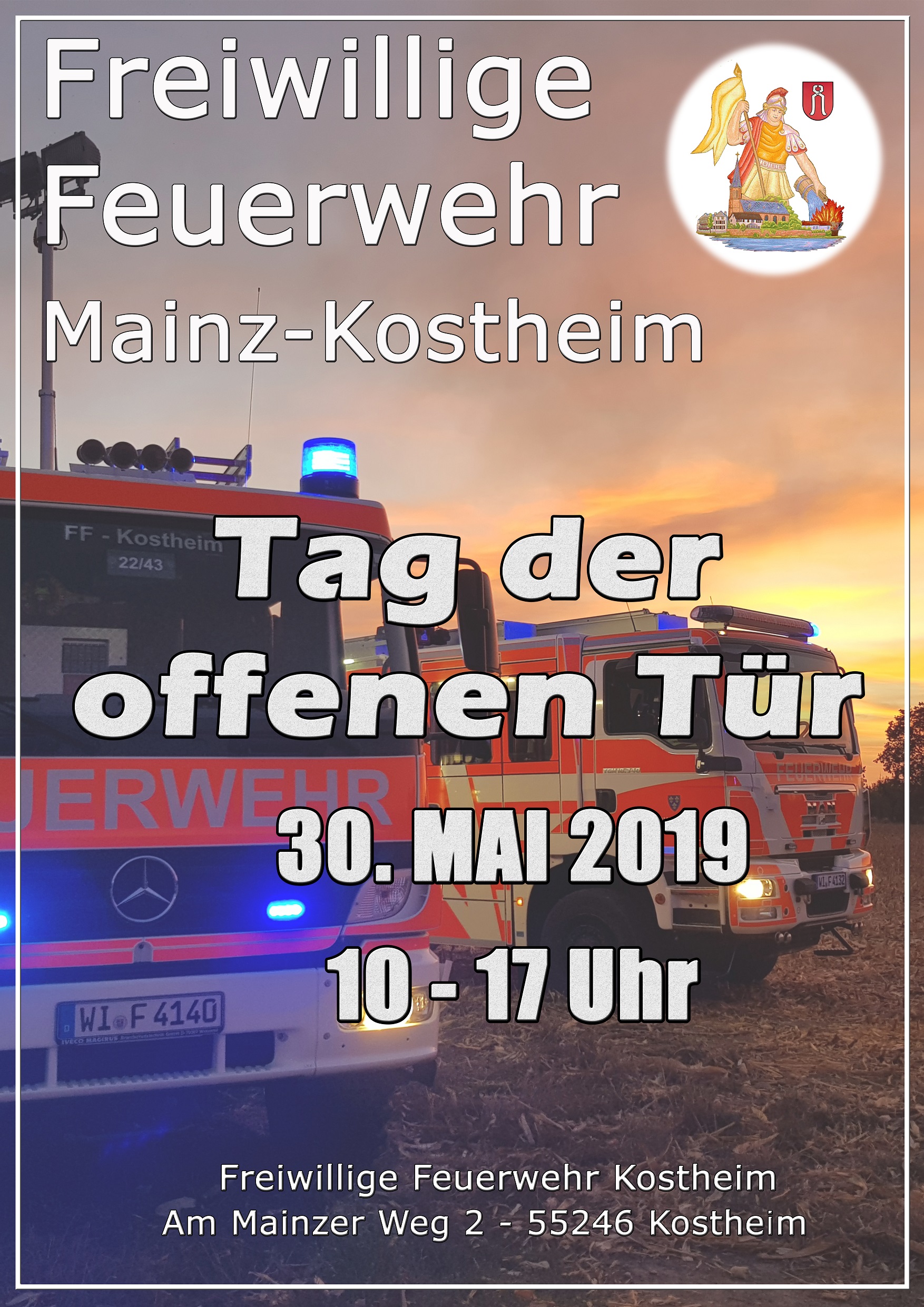 Am 30. Mai 2019 (Vatertag) veranstaltet die Kostheimer Feuerwehr wieder ihren im Zweijahresrhythmus stattfindenden „Tag der offenen Tür“. In der Zeit zwischen 10 und 17 Uhr haben die Gäste die Möglichkeit, sich über das etwas andere Hobby Feuerwehr sowie dessen umfangreiche Aufgabenbereiche zu informieren. Da die Nachwuchsarbeit, neben dem Einsatzdienst, stets im Fokus steht, können an diesem Tag interessierte Kinder und Jugendliche hautnah Informationen über die Bambini- und Jugendfeuerwehr einholen. Für das leibliche Wohl ist selbstverständlich auch gesorgt, sodass einem gemütlichen Aufenthalt im Kreise der Feuerwehr Kostheim nichts im Wege steht.