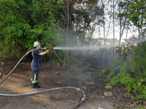 Während die ersten Strahlrohre – von insgesamt drei – zur Brandbekämpfung aufgebaut wurden, verlegte man zudem noch eine 400 Meter lange Schlauchleitung zum nächst gelegenen Unterflurhydrant in der Nähe des Bahnübergangs. Zeitweise waren die vorgehenden Trupps aufgrund der starken Rauchentwicklung mit Atemschutz ausgerüstet.