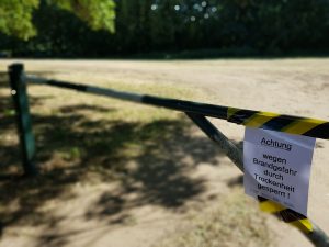 Auch in Kostheim werden ab heute Vorkehrungen zum Vorbeugen von Flächenbränden getroffen. Die auf der Maaraue als Parkplatz für das Freibad genutzte Rasenfläche gegenüber dem Kleingartengeländes wird vom Betreiber des Schwimmbades auf Anraten der städtischen Brandschutzbehörde gesperrt. Zu groß ist die Gefahr, dass gerade erst abgestellte Fahrzeug durch die heiße Abgasanlage Brände auf dem völlig ausgetrockneten Gelände entfachen.